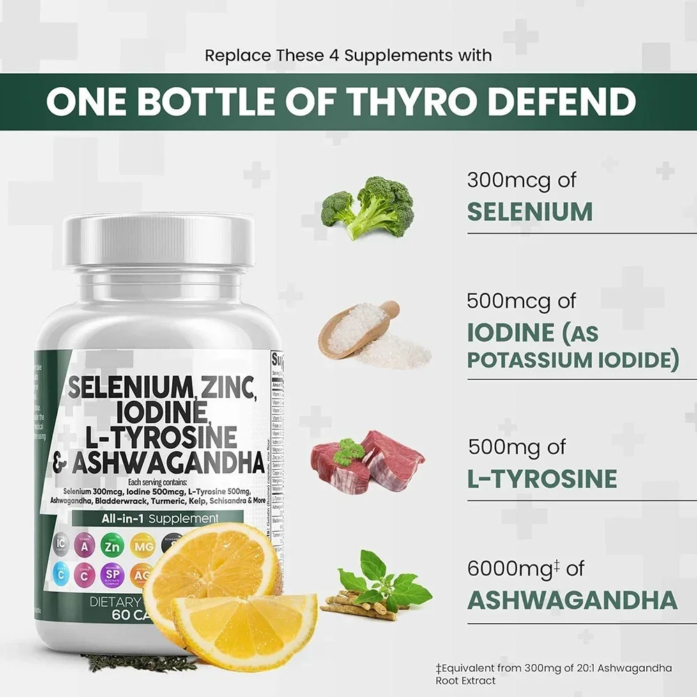 The ultimate thyroid complex and iodine supplement you've been looking for, offering 5 full-dose products in one thyroid support complex, containing a complete zinc supplement, thyroid iodine supplement, selenium supplement, tyrosine powder, and iodine supplement Ashwagandha supplement, convenient 2 capsule dose.